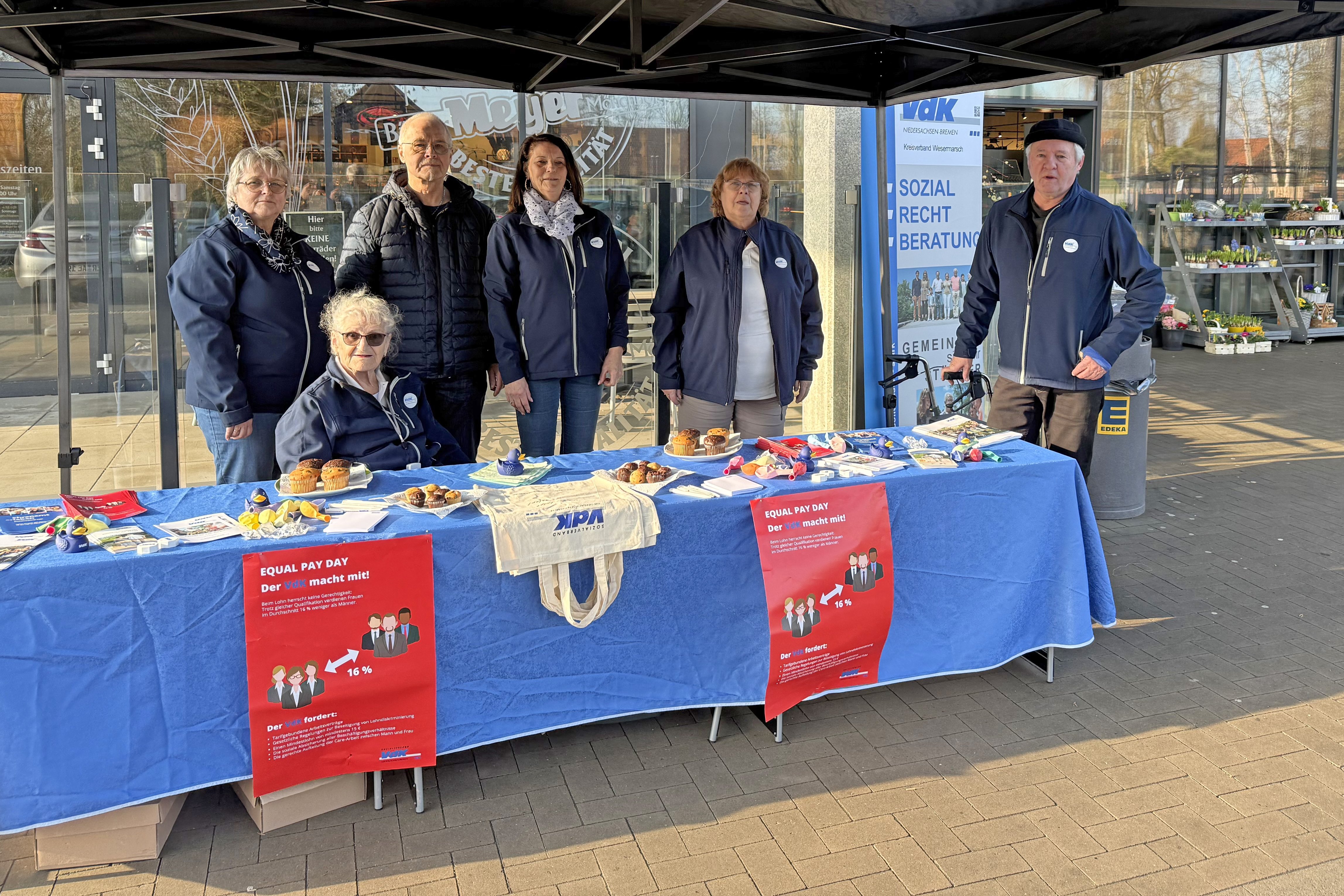 Ehrenamtliche aus dem Kreisverband Wesermarsch haben am Freitag, den 27. Februar 2026 von 10 bis 12 Uhr mit einem Infostand vor dem EDEKA Markt Ulken auf den Externer Link:Equal Pay Day aufmerksam gemacht und über die VdK-Forderungen informiert.