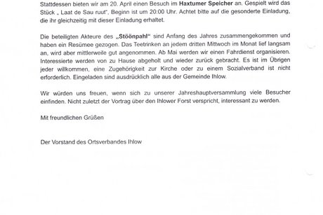 Wie in jedem Jahr legt der OV Ihlow zum Anfang des Jahres einen Rechenschaftsbericht ab. Es gibt Informationen über die Veranstaltungen des vergangenen Jahres, eine Ausschau zu den Aktivitäten des laufenden Jahres und der Bericht zum finanziellen Stand. Die Veranstaltung ist für die Mitglieder kostenlos. Zum Ende der Veranstaltung wird ein kleiner Imbiss gereicht